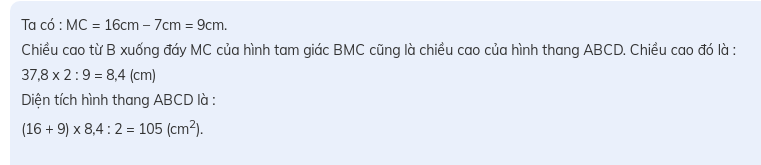 Hình thang ABCD có đáy lớn DC = 16cm ; đáy bé AB =9cm . Biết DM = 7cm , diện tích hình tam giác BMC bằng 37,8 cm^2 (xem hình vẽ bên ) . Tính diện tích hình thang ABCD