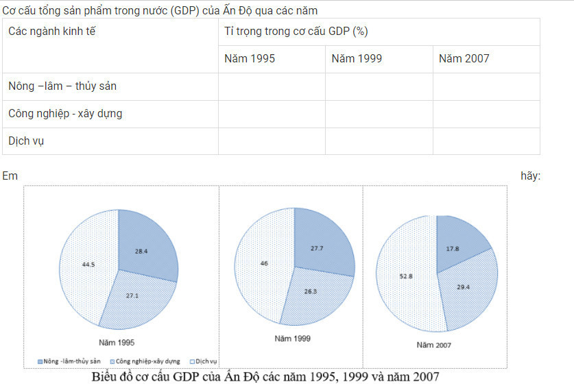 A: vẽ biểu đồ cột chồng thể hiện cơ cấu GDP các năm của Ấn Độ