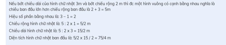 Diện tích hình chữ nhật ban đầu là: 5/2 x 15/2 = 75/4 m