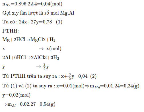 Bài 2. Hỗn hợp 2 kim loại Mg và Al có khối lượng 0,78 g được hoà tan hoàn toàn bằng dung dịch axit clohiđric (HCI). Sau phản ứng thu được 0,896 | khí H2 (đktc). Tính khối lượng mỗi kim loại trong hỗn hợp đầu.