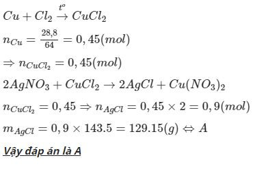 Cho 28,8 gam Cu tác dụng với lượng vừa đủ khí Clo sau phản ứng thu được chất rắn X. Cho toàn bộ lượng chất rắn X vào dung dịch AgNO3 dư thì khối lượng kết tủa thu được là: