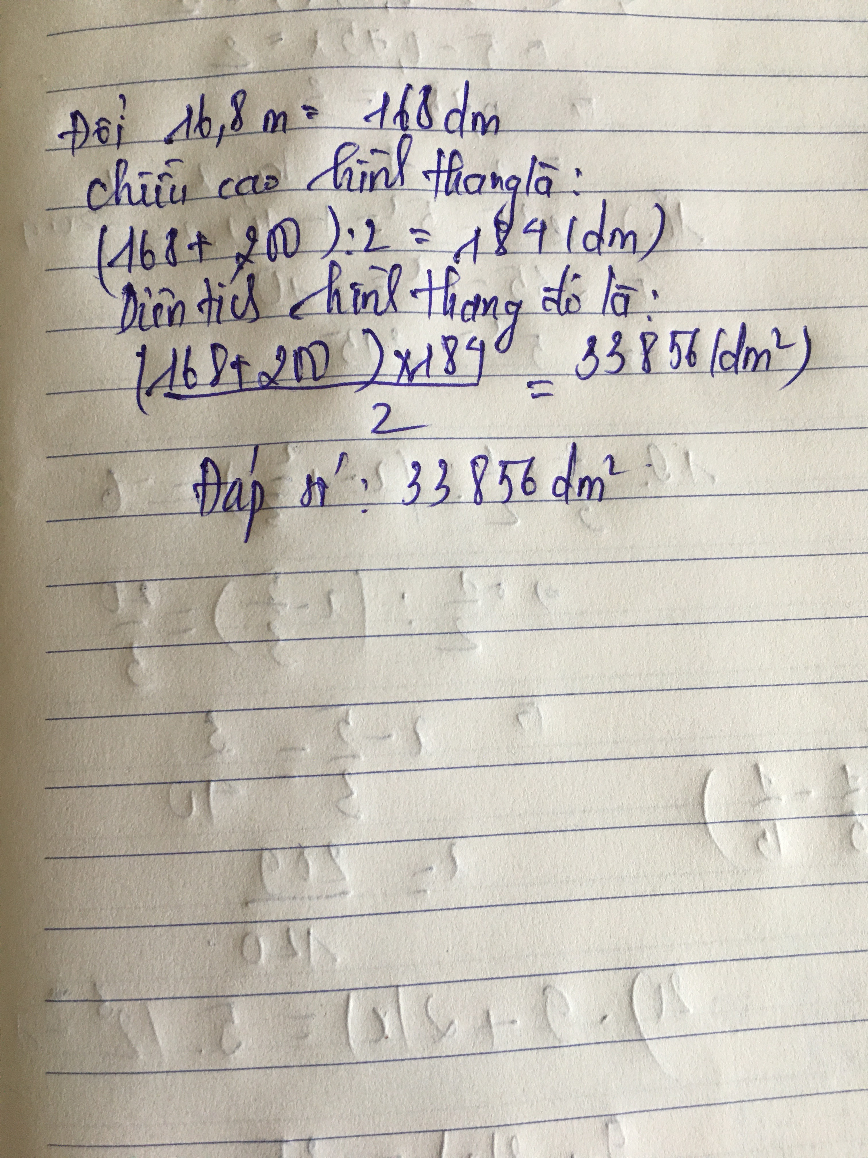 Diện tích: ((168+200)x184):2=33856