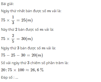 Một người phải dệt 75 mét vải trong 3 ngày . Ngày thứ nhất dệt được tấm , ngày thứ hai dệt được tấm . Hỏi số vải ngày thứ ba phải dệt là bao nhiêu ? Số vải chiếm bao nhiêu phần trăm ?