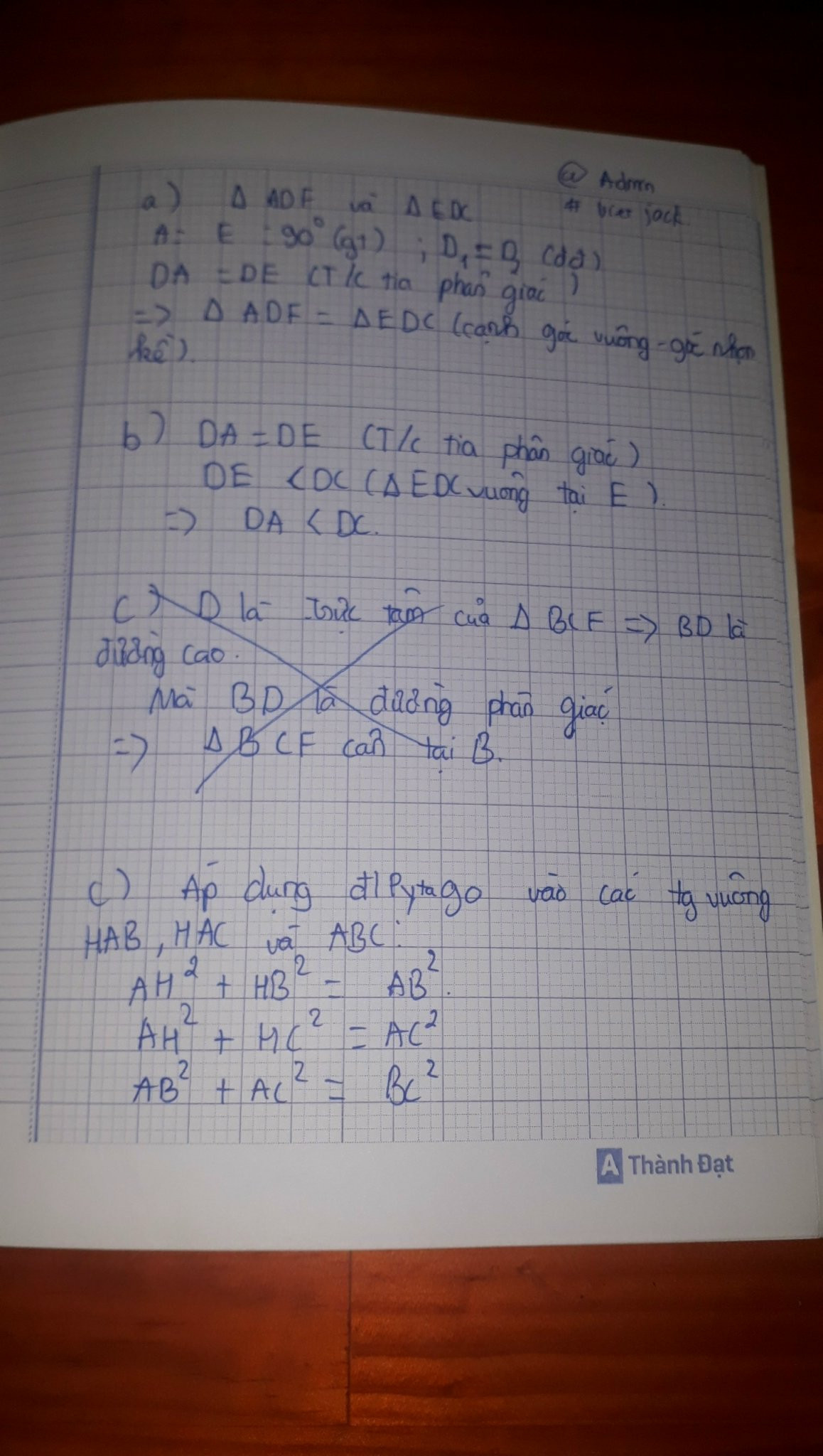 Cho tam giác ABC vuông tại A . Đường phân giác của góc B cắt AC tại D . Từ Đó kẻ DE vuông góc vs BC ( E thuộc BC ) . Đường thẳng ED cắt BA tại F