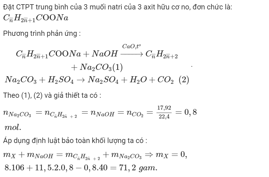 Nung m gam hỗn hợp X gồm 3 muối natri của 3 axit hữu cơ no, đơn chức với NaOH dư, thu được chất rắn D và hỗn hợp Y gồm 3 ankan. Tỉ khối của Y so với H2 là 11, 5 . Cho D tác dụng với H2SO4 dư thu được 17,92 lit CO2 (dktc).