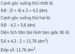 Một tấm bìu hình tam giác vuông có tổng số đo hai cạnh góc vuông là 9.8 dm vuông. Biết cạnh góc vuông thứ nhất bằng cạnh góc vuông thứ hai. Tính diện tích tấm bìa hình tam giác đó.