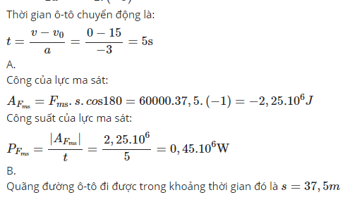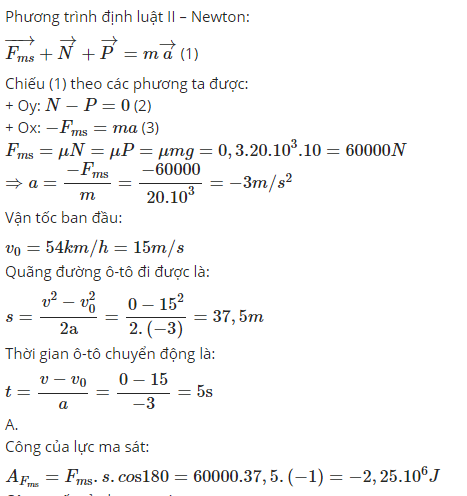 Một ô tô có khối lượng 20 tấn chuyển động chậm dần đều trên đường nằm ngang dưới tác dụng của lực ma sát ( hệ số ma sát bằng 0,3) .Vận tốc đầu của ô tô là 54km/h .Sau một khoảng thời gian thì ô tô dừng lại
