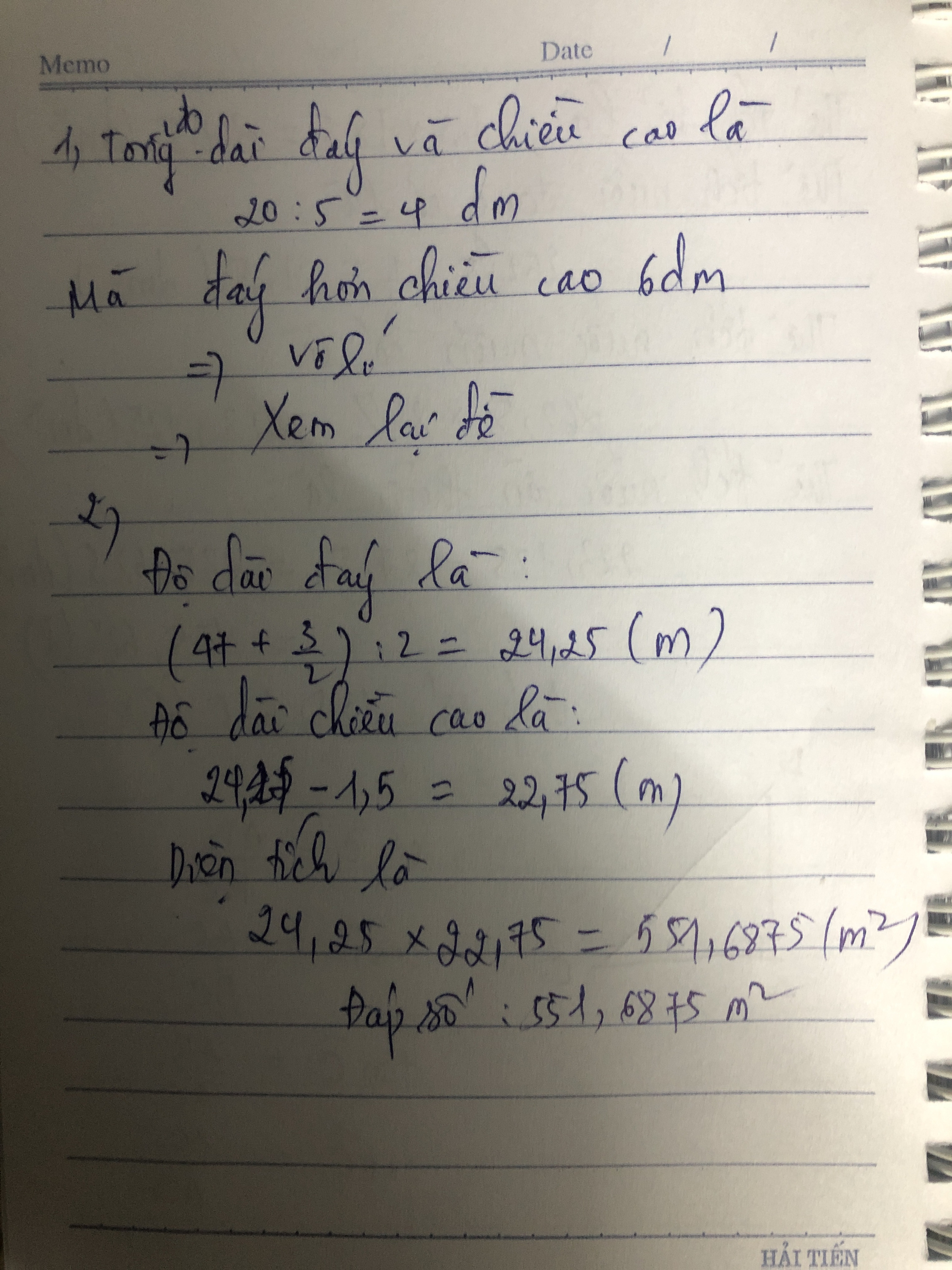 Một hình bình hành có tổng độ dài đáy và chiều cao là 20/5, biết độ dài đáy hơn chiều cao là 6dm