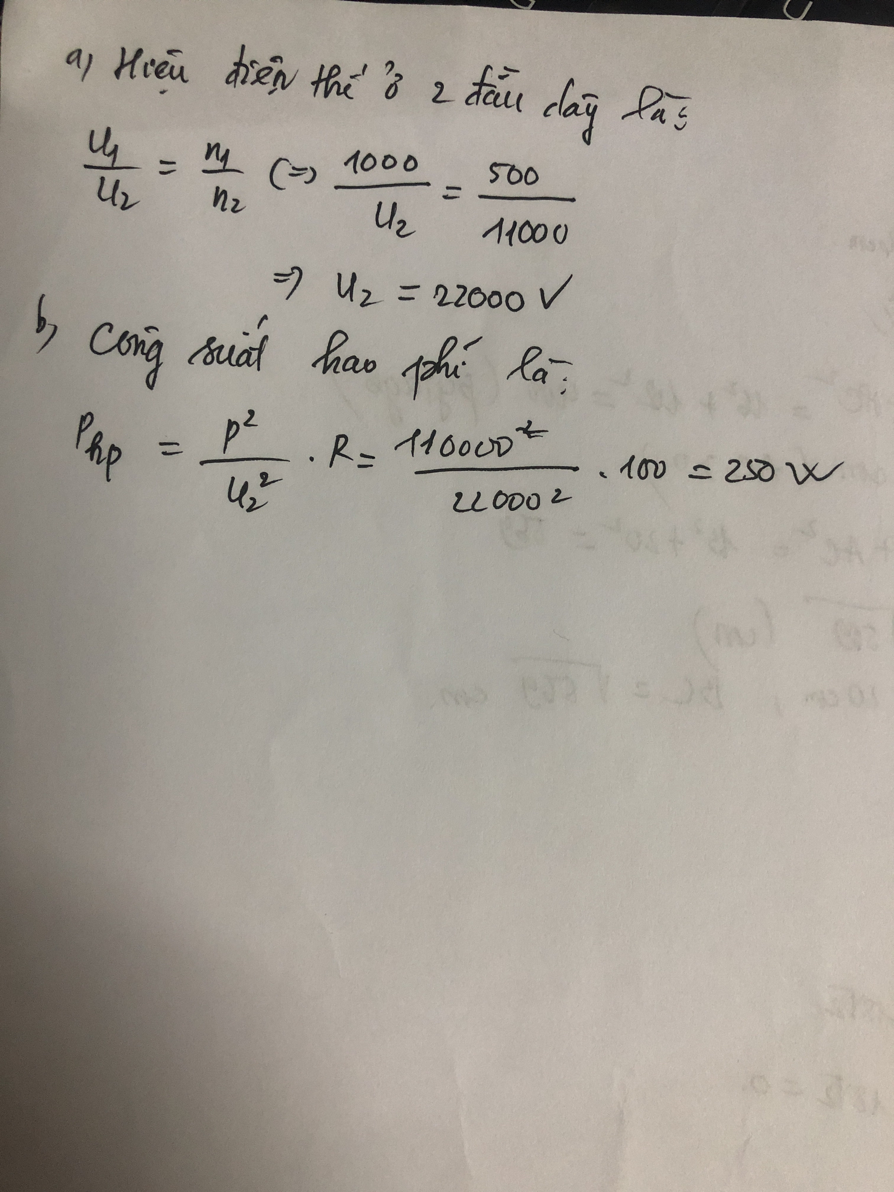 B/ tính công suất hao phí trên đường dây tải điện biết rằng điện trở tổng cộng của đường dây này là 100 ôm
