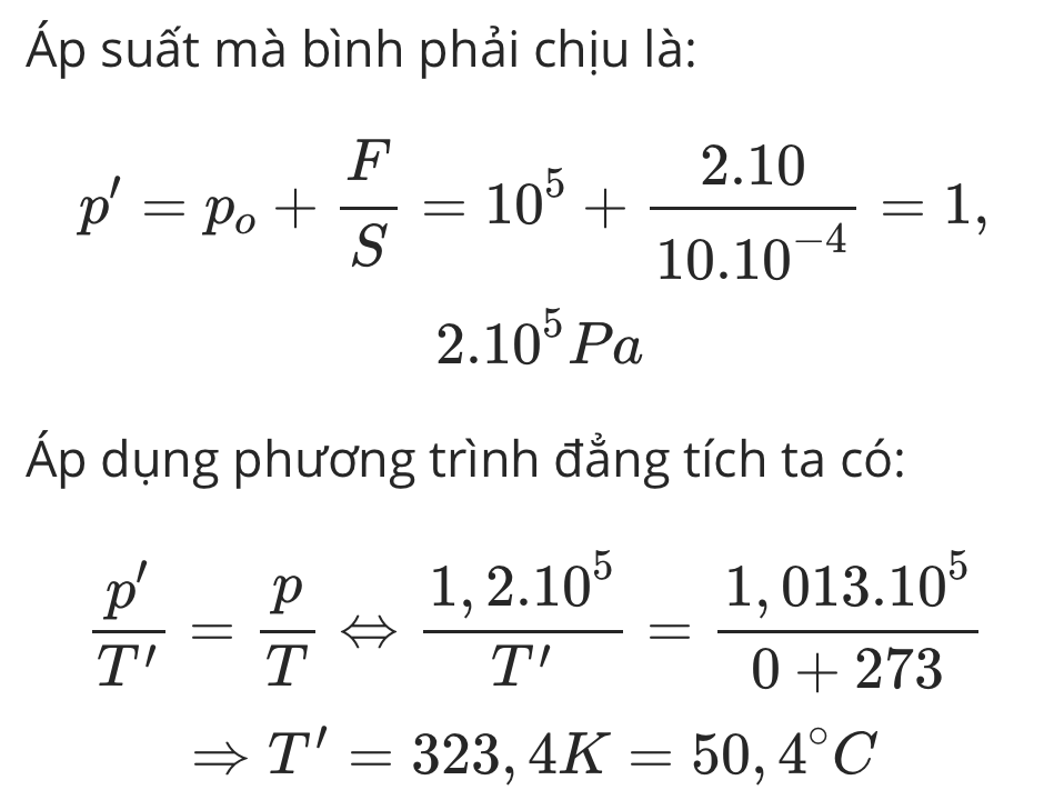Một bình đầy không khí ở điều kiện tiêu chuẩn (00C; 1,013. 105Pa) được đậy bằng một nắp có trọng lượng 20N. Biết áp suất khí quyển là p0 = 105Pa và tiết diện của miệng bình 10cm2. Nhiệt độ lớn nhất của không khí trong bình để không khí không đẩy được nắp bình lên và thoát ra ngoài bằng