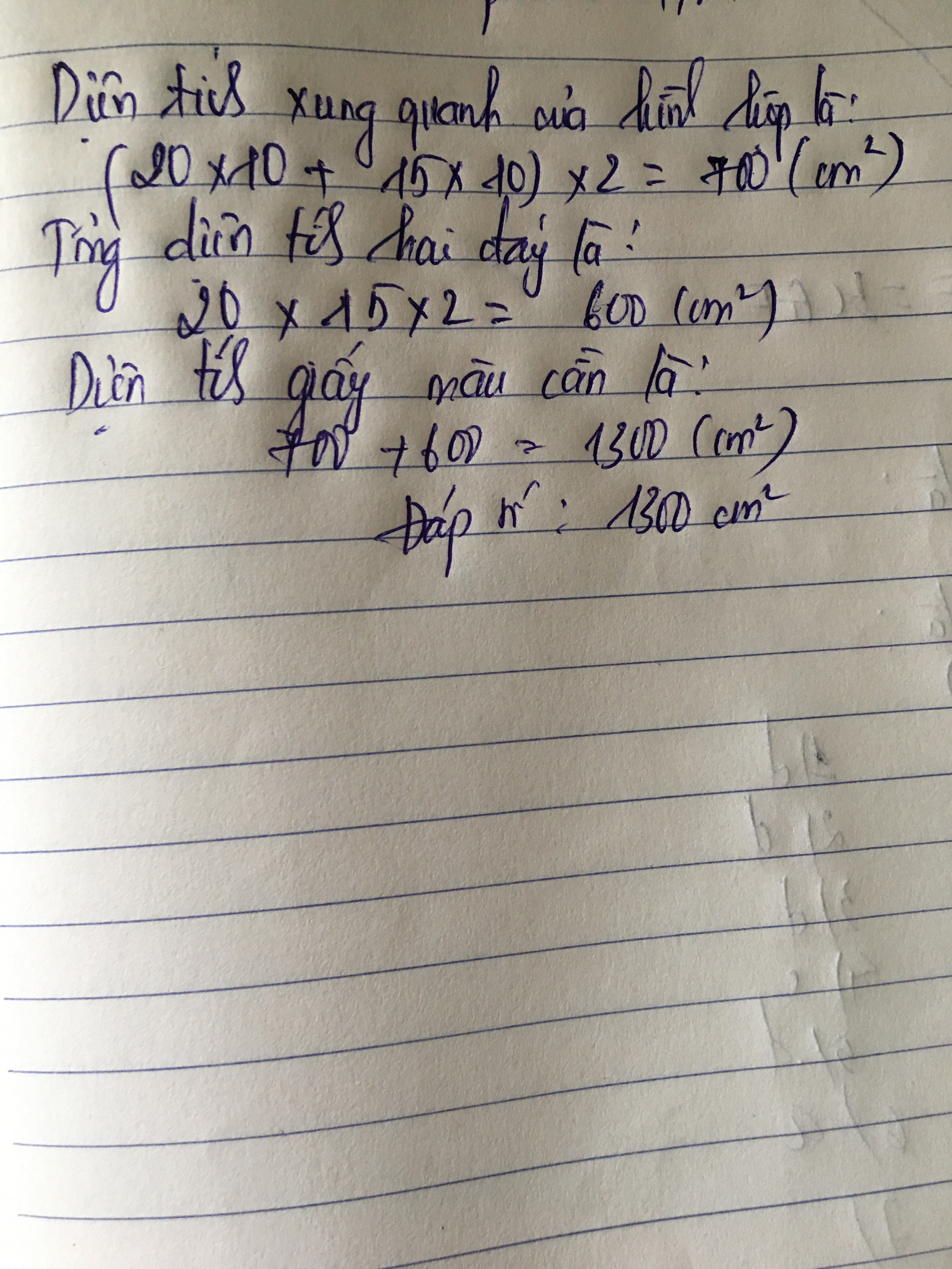 Cái hộp dạng hình chữ nhật có chiều dài 20 cm, chiều rộng 15 cm, chiều cao 10 cm. An mua giấy màu để dán các mặt xung quanh và hai mặt đáy của cái hộp đó. Hỏi diện tích giấy màu cần mua là bao nhiêu?
