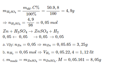 Để hòa tan m(g)Zn vừa đủ 50g dd H2So4 9,8% a) Tính m B) Tính VH2(dktc) C) tính khối lượng muối sau phản ứng
