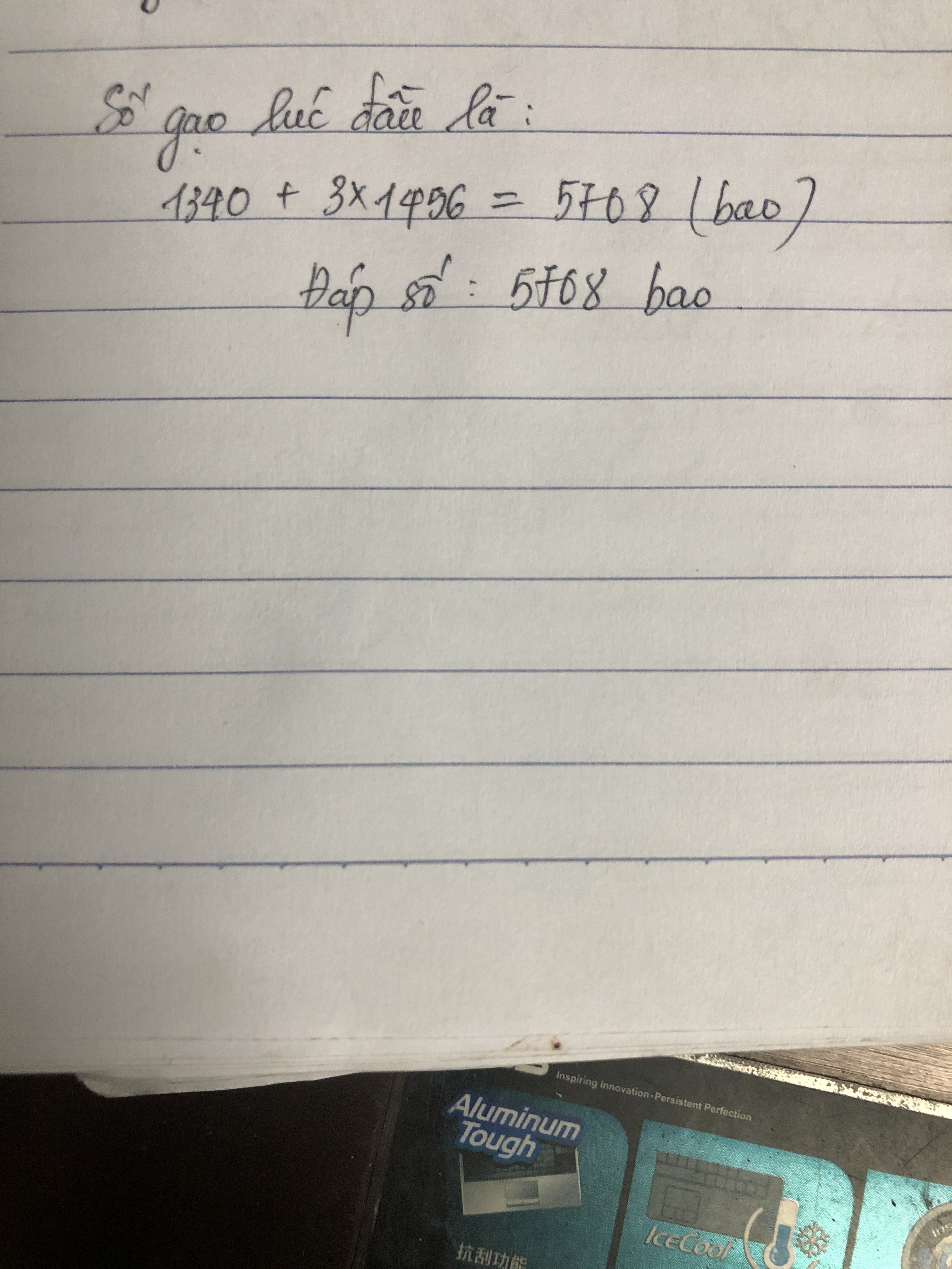 sau khi chuyển đi 3 xe mỗi xe chở 1456 bao gạo trong kho còn lại 1340 bao gạo tính số bao gạo lúc đầu có trong kho đó