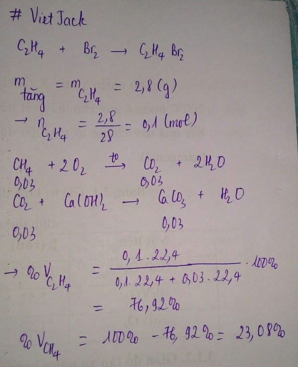 Cho v(l) hỗn hợp khí CH4 và C2H4 đi qua dd Br 10% có dư thấy khối lượng bình chứa dung dịch Br tăng thêm 2,8g. Đem khí còn lại đốt cháy, dẫn sản phẩm thu được vào bình chứa nước vôi trong dư thấy tạo ra 3g kết tủa. Tính thành phần % theo thể tích theo mỗi khí CH4 và C2H4.