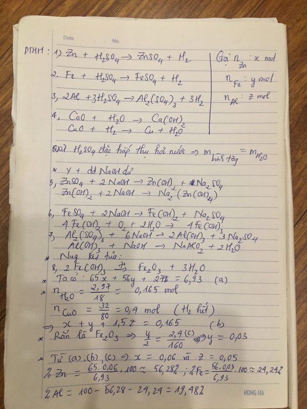 Hòa tan hoàn toàn 6,93 gam hỗn hợp gồm Zn, Fe, Al trong dung dịch H2SO4 loãng thu được khí X và dung dịch Y. Cho khí X đi qua vôi sống, sau đó cho đi qua 32 gam CuO đốt nóng , cuối cùng cho qua H2SO4 đặc . Sau thí nghiệm khối lượng bình đựng H2SO4 đặc tăng thêm 2,97 gam. Dung dich Y cho tác dụng với NaOH dư , nung nóng trong không khí. Lọc lấy kết tủa , rồi nung nóng đến khối lượng không đổi, thu được 2,4 gam chất rắn. Hãy viết các phương trình xảy ra và tính thành phần phần trăm mỗi kim loại trong hỗn hợp ban đầu, biết rằng các phản ứng đều có hiệu suất 100%.