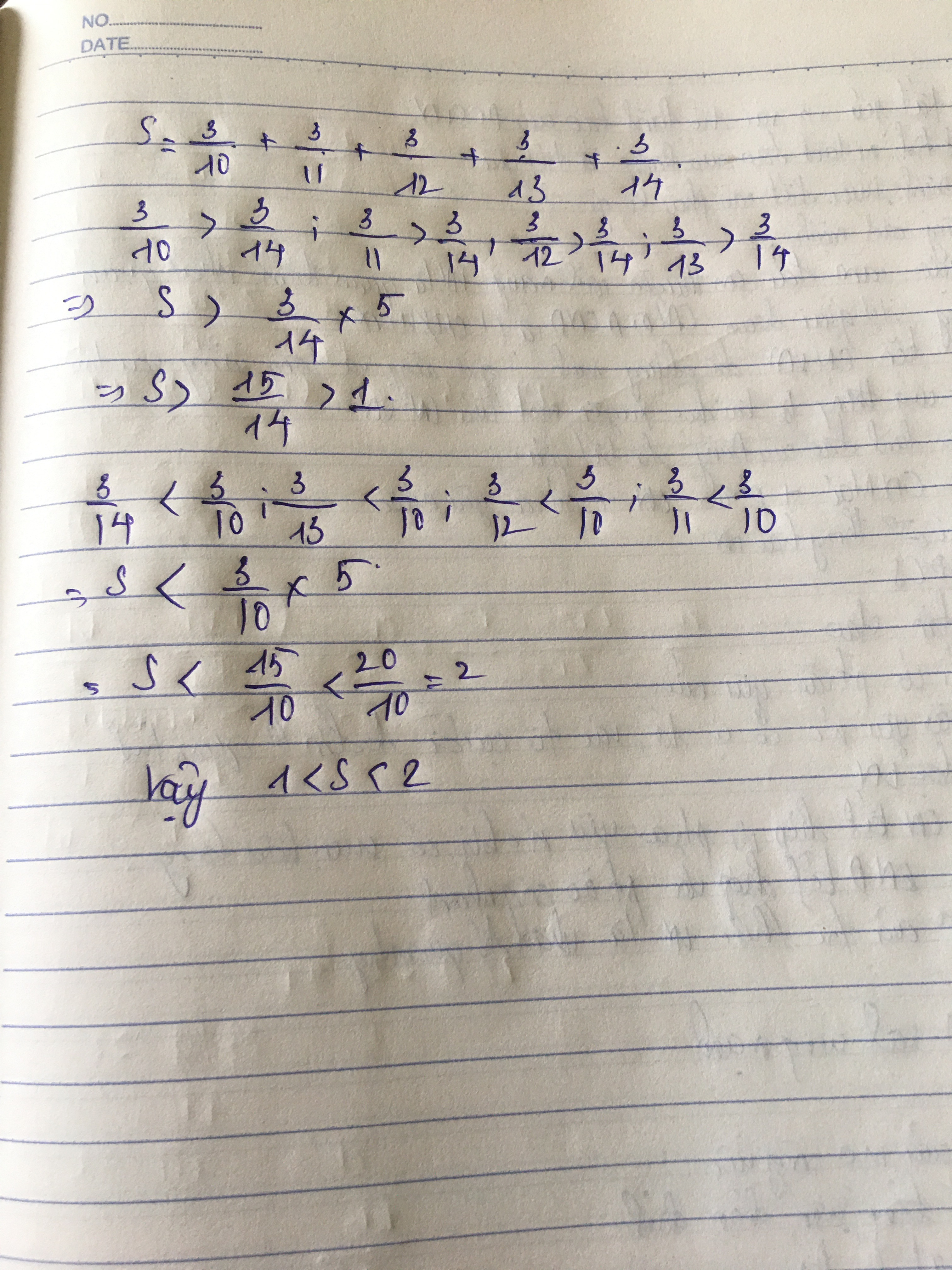 cho s= 3/10+3/11+3/12+3/13+3/14 chung minh rang 1<S<2