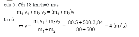Câu 5: Một người nặng 80 kg đang chạy với vận tốc 18km/h đuổi theo một chiếc xe nặng 500kg đang chuyển động với vận tốc 3,84m/s và nhảy lên đó . Tìm vận tốc chuyển động của xe và người sau đó?