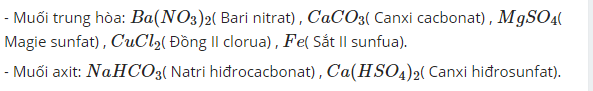 Cho các muối sau: NaHCO3, Ba(NO3)2, CaCO3, MgSO4, Ca(HSO4)2, CuCl2, FeS. Phân loại và gọi tên các muối trung tính.