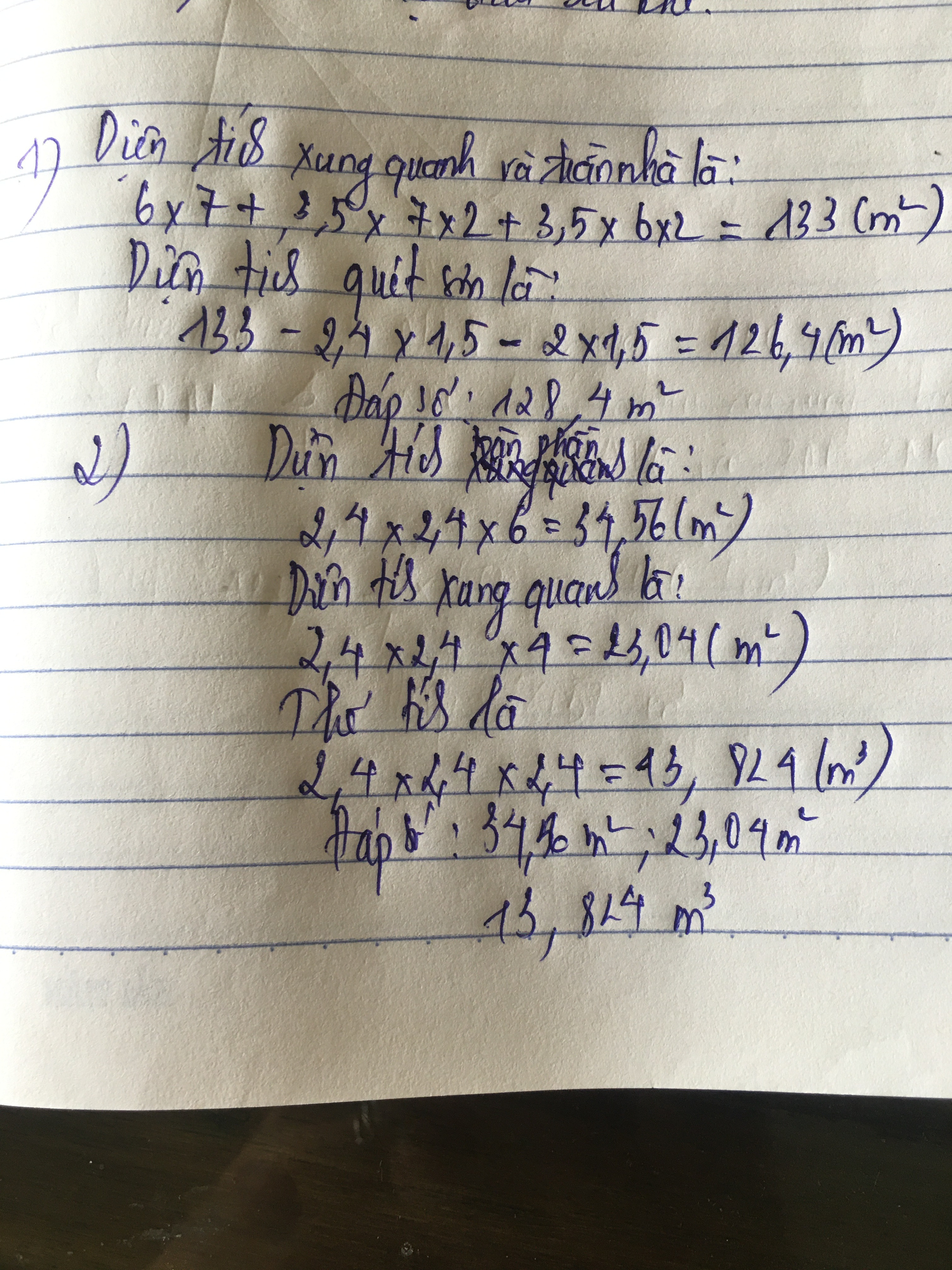 Một căn phòng có chiều dài 6m,rộng 7m,cao 3,5m.một cửa sổ dài 2m,cao 1,5m,một cửa ra vào cao2,4m,rộng 1,5m.người ta dự định quét sơn trần và 4 bức tường.tính diện tích quét sơn