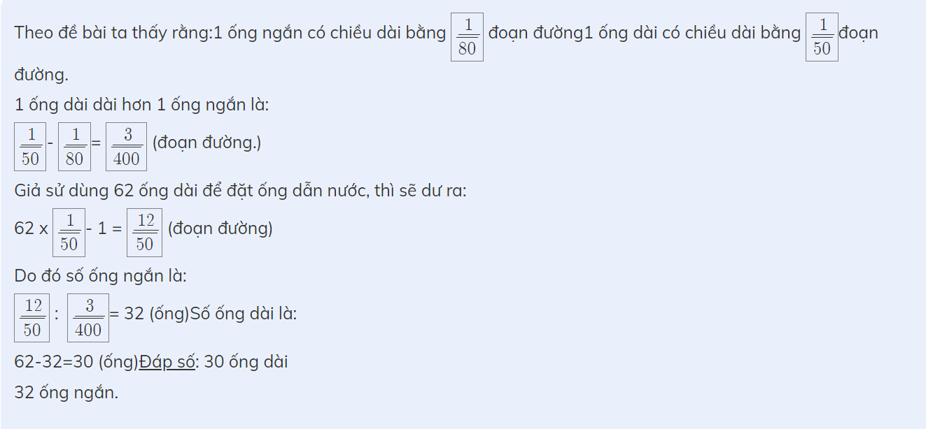 Giả sử 62 ống đều là ống dài thì đoạn đường là: