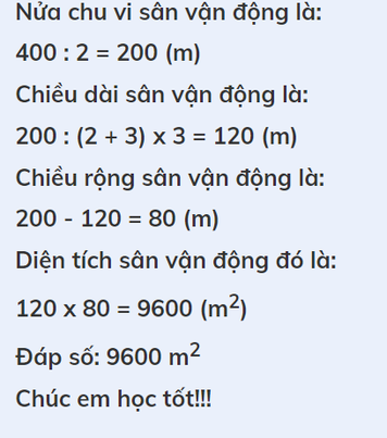 Một sân vận động hình chữ nhật có chu vi 400m, chiều rộng bằng 2/3chiều dài.Tính diện tích của sân vận động đó?