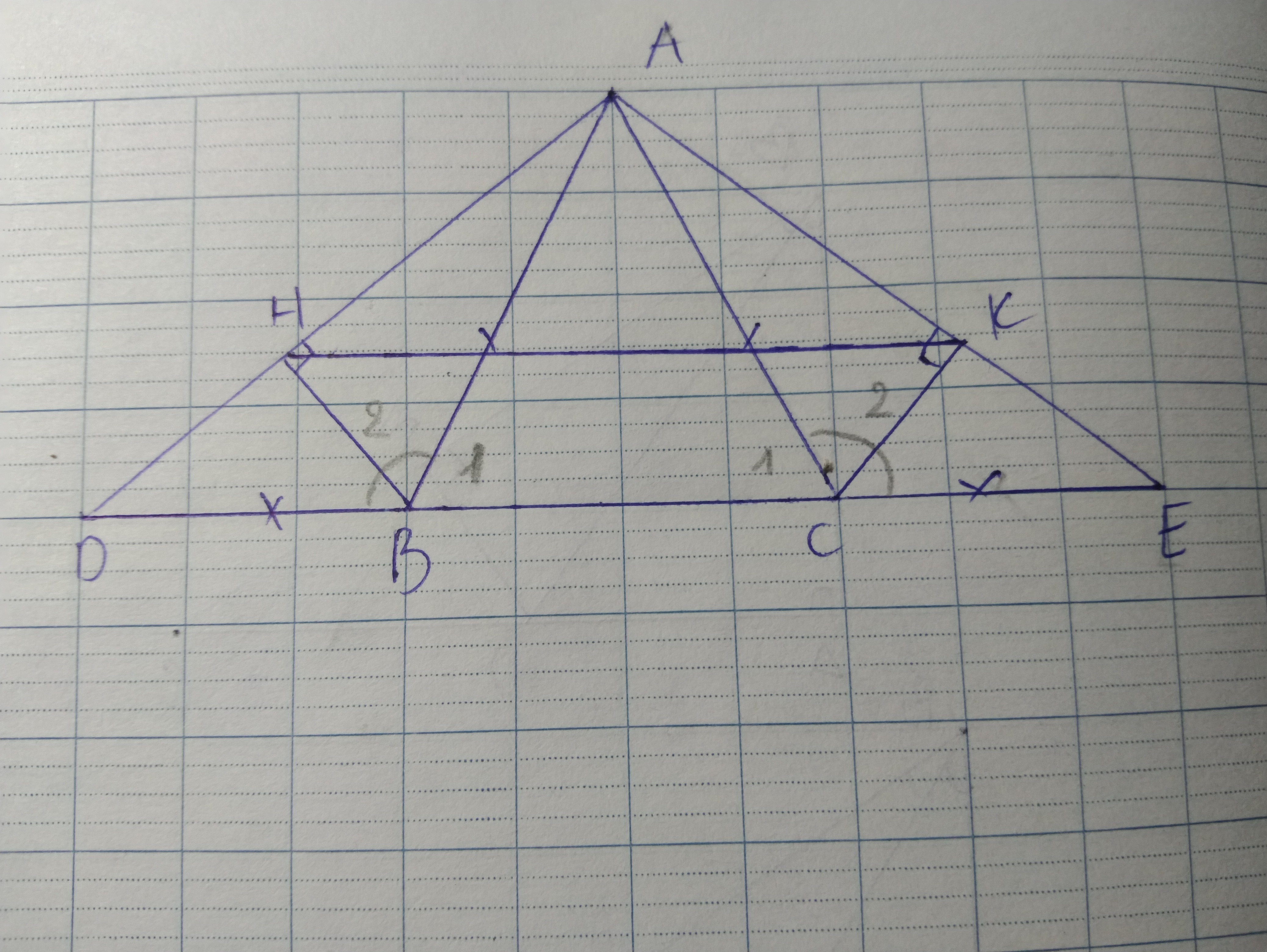 cho tam giác ABC cân tại A . Trên tia đối caut tia BC lấy điểm D, trên tia đối của tia CB lấy điểm E sao cah BD=CE. Kẻ BH ( T nằm ngược tại ko có dấu ấy) AD tại H, CK ( chữ T nằm ngược) AE tại K. Chứng minh
