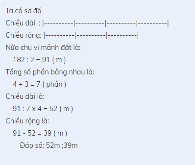 Một mảnh đất hình chữ nhật có chu vi 182 m chiều rộng bằng 3/4 chiều dài . Tìm chiều dài và chiều rộng của mảnh đất đó