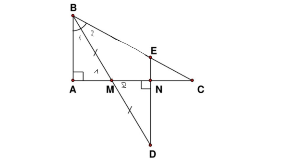 Cho tam giác ABC vuông tại A(AB<AC),tia phân giác của góc B cắt AC tại M.Trên Tia đối của tia MB lấy điểm D sao cho MB=MD,từ điểm D vẽ đường thẳng vuông góc với AC tại N và cắt BC tại điểm E.