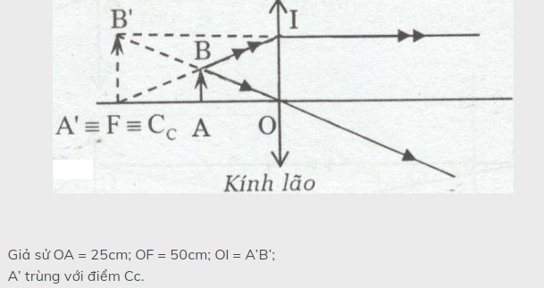 Một người bị tật lão thị, biết điểm cực cận của mắt người ấy cách mắt 50cm. Khi đeo kính người ấy có thể nhìn rõ vật gần nhất cách mắt 25cm.Tính tiêu cự của kính
