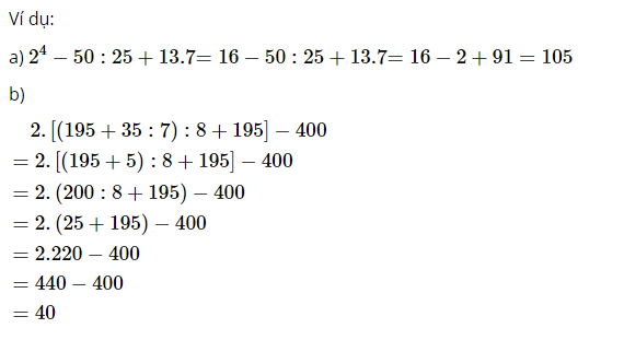 - Nếu có các phép tính cộng, trừ, nhân, chia, nâng lên lũy thừa, ta thực hiện phép tính nâng lên lũy thừa trước, rồi đến phép nhân và phép chia, cuối cùng đến phép cộng và trừ.