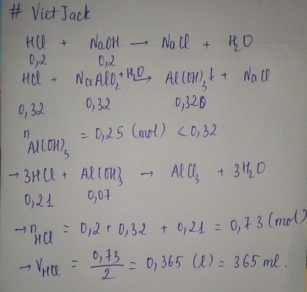 Cho V ml dung dịch HCl 2M vào 400ml dung dịch chứa NaOH 0,5M và NaAlO2 0,8M thì thu được 19,5g kết tủa. Tính thể tích dung dịch HCl tối thiểu cần dùng là.