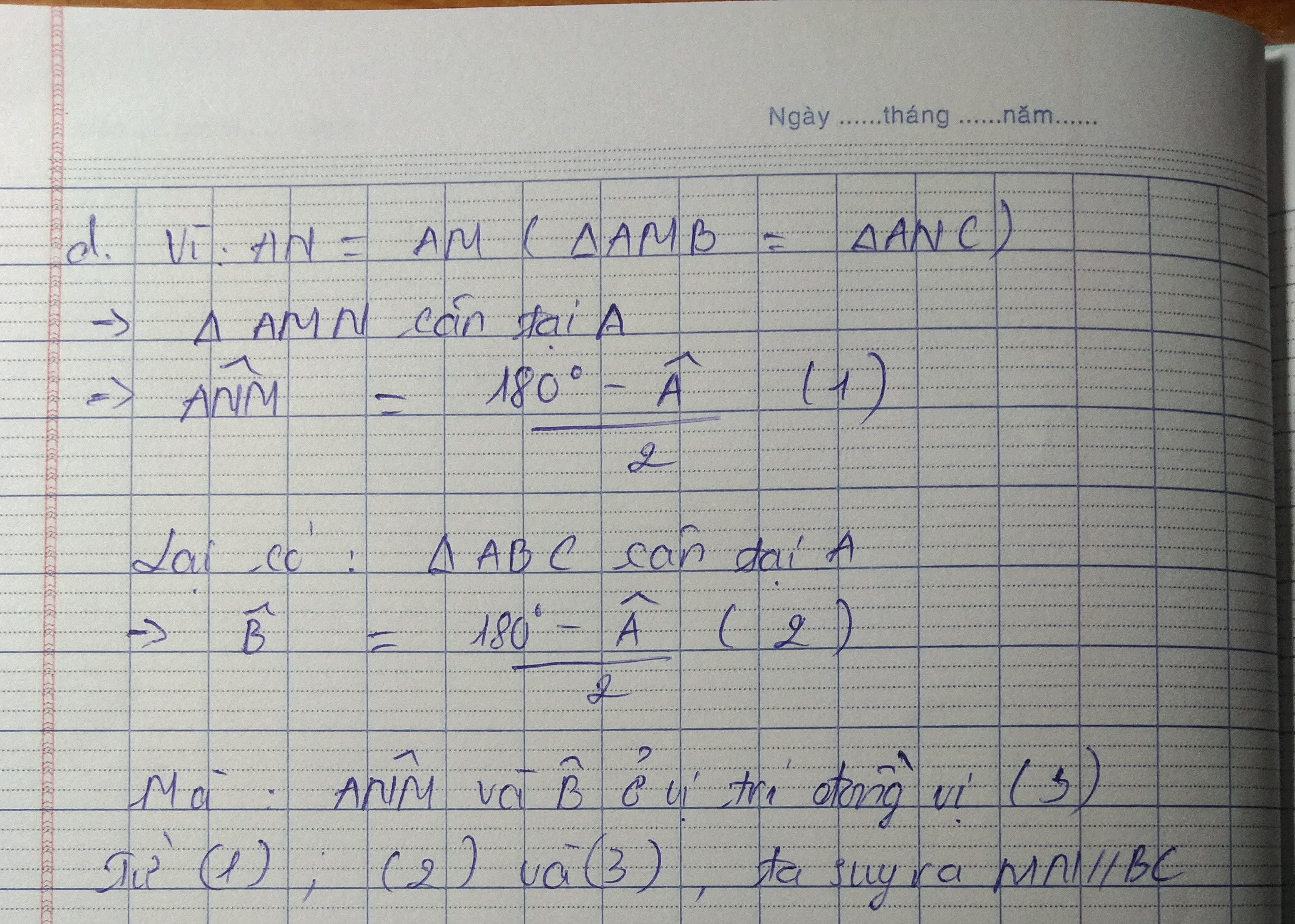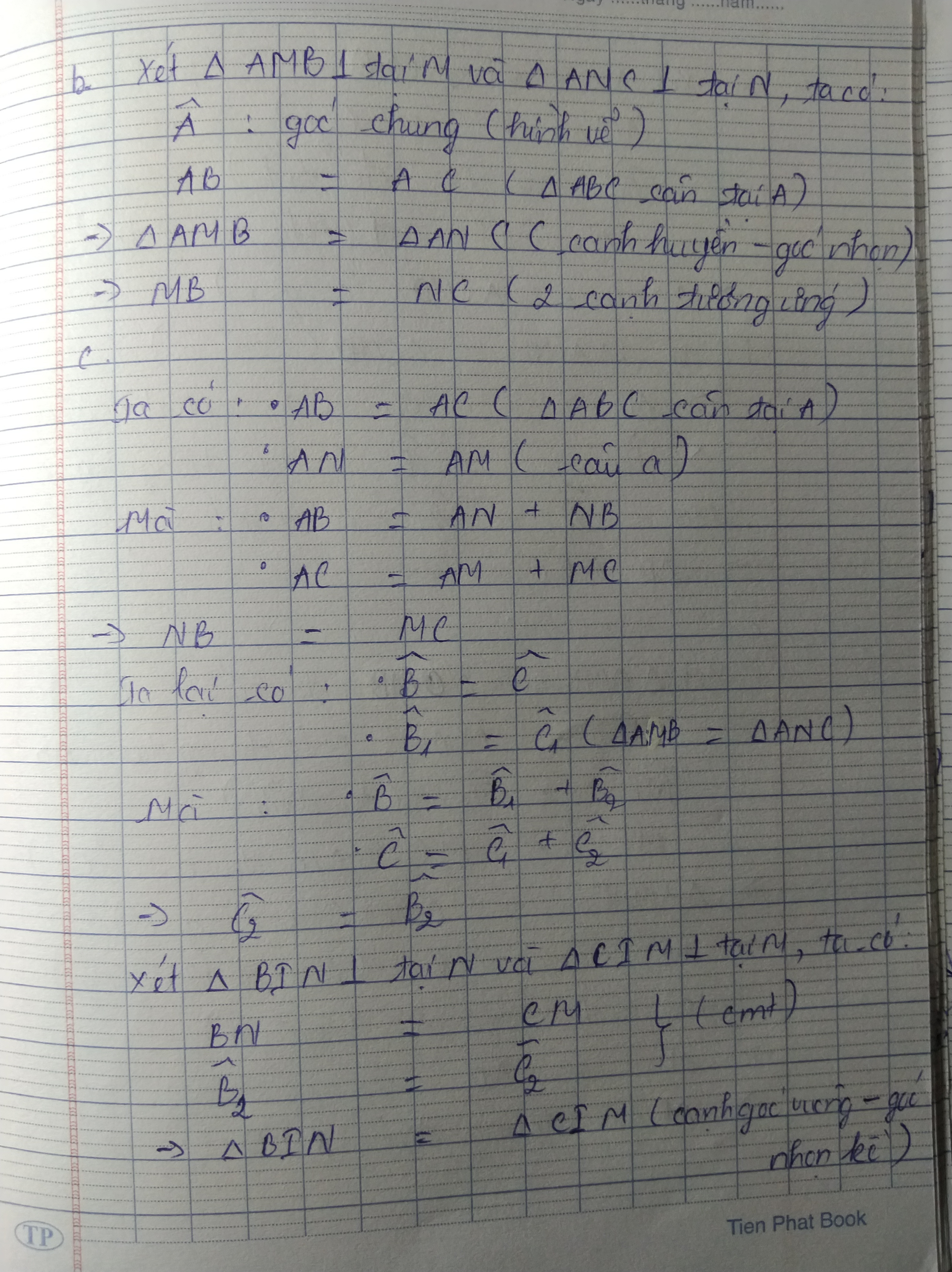 c) Gọi I là giao điểm của BM và CN chứng minh IB = IC