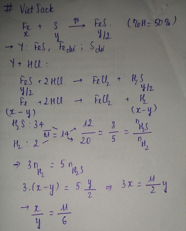 Nung nóng hỗn hợp bột X gồm x mol Fe và y mol S trong khí trơ,hiệu suất phản ứng bằng 50%, thu được hỗn hợp rắn Y. Cho Y vào dd HCl dư, sau khi các phản ứng xảy ra hoàn toàn, thu được hỗn hợp khí Z có tỉ khối so với H2 bằng 7. Tỉ lệ x:y là bao nhiêu?
