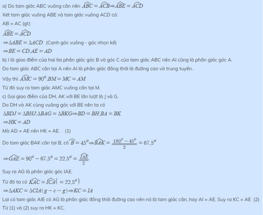 Cho tam giác vuông cân ABC (AB = AC), tia phân giác của các góc B và C cắt AC và AB lần lượt tại E và D.