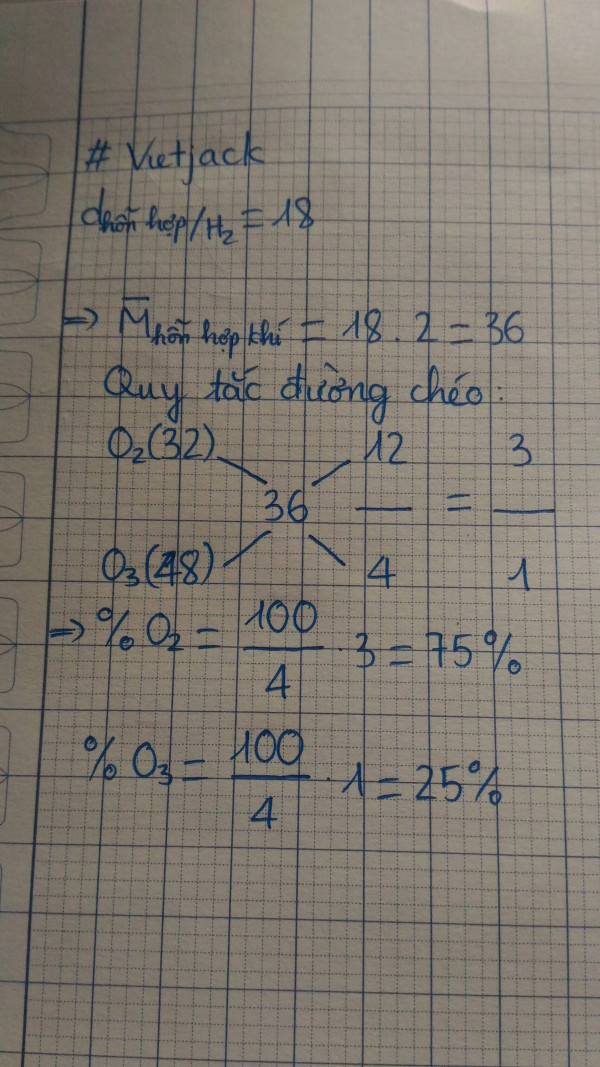 Có một hỗn hợp khí gồm Oxi và Ozon hỗn hợp khí này có tỉ khối đối với Hidro là bằng 18 Hãy xác định thành phần phần trăm theo thể tích của hỗn hợp khí