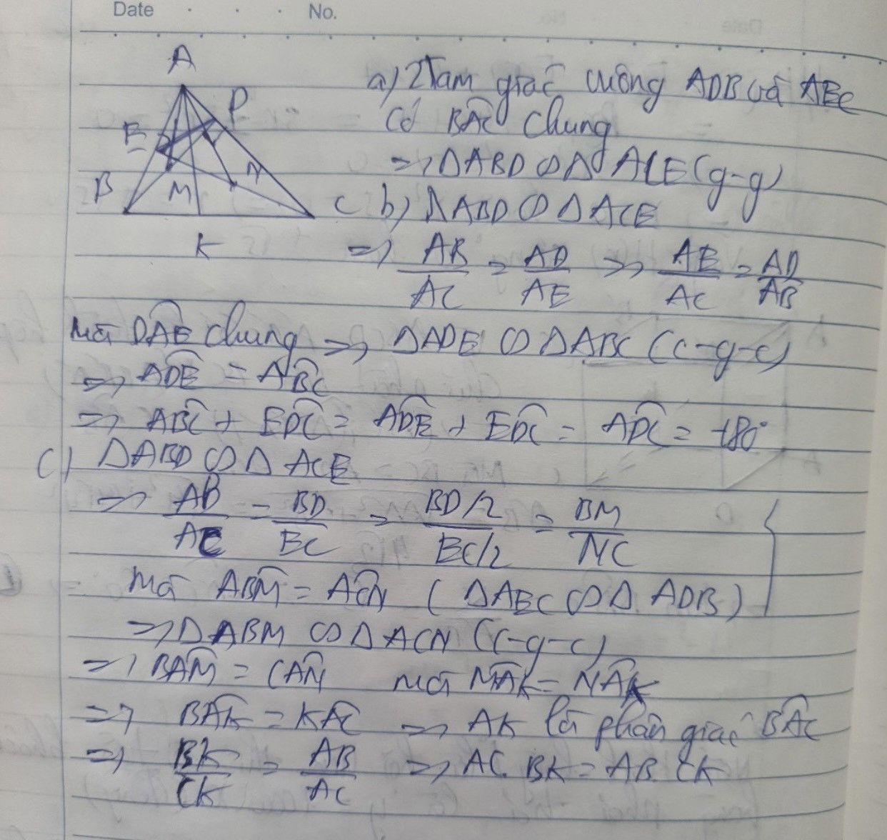 c) gọi MN lần lượt là trung điểm BD và CE. Vẽ AJ là phân giác góc MAN (J thuộc BC). CMR JB.AC=JC.AB