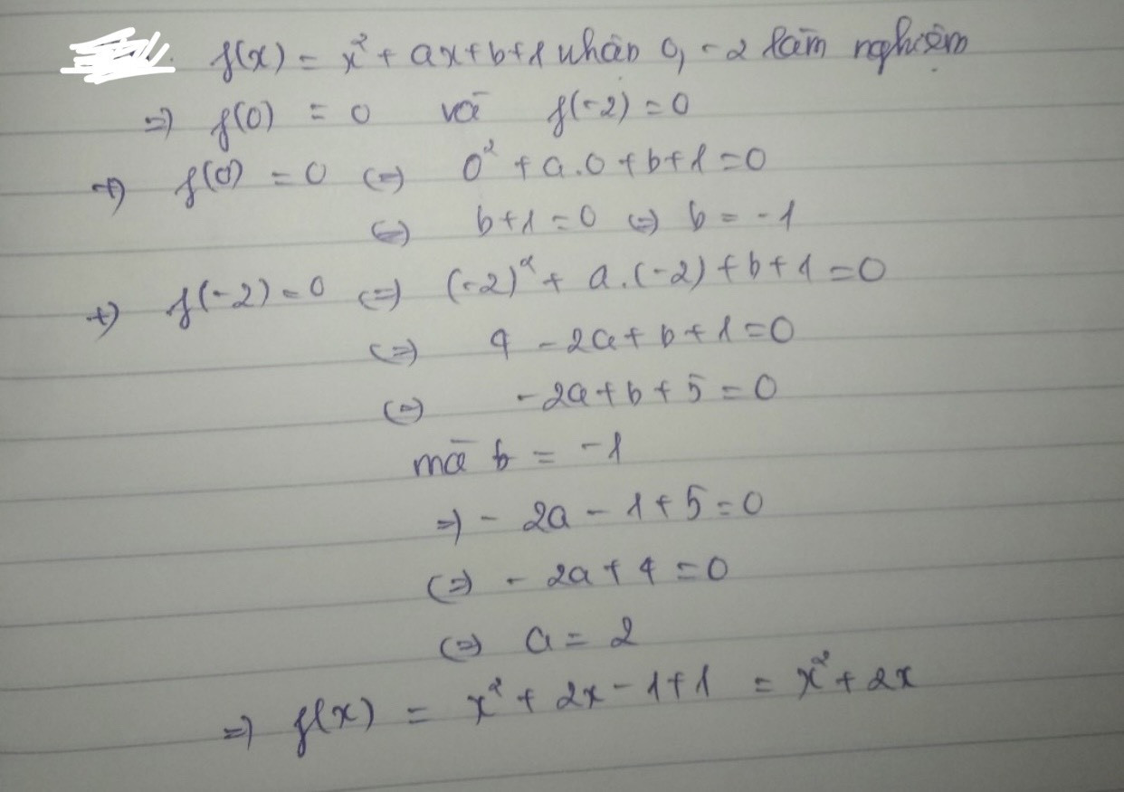 f(x)=x^2+ax+b+1 nhận các số 0;-2 làm nghiệm