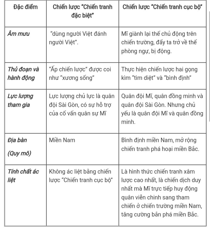 So sánh điểm giống và khác nhau giữa chiến lược “Chiến tranh đặc biệt”, chiến lược "Chiến tranh cục bộ" và chiến lược "Việt Nam hóa chiến tranh"?
