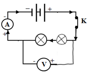 vẽ sơ đồ mạch điện 1 pin 2 đèn mắc nối tiếp ampe kế A đo cường độ dòng điện chạy qua mạch vôn kế đo hiệu điện thế giữa 2 đầu bóng đèn 2 xác định chiều dòng điện chạy qua mạch