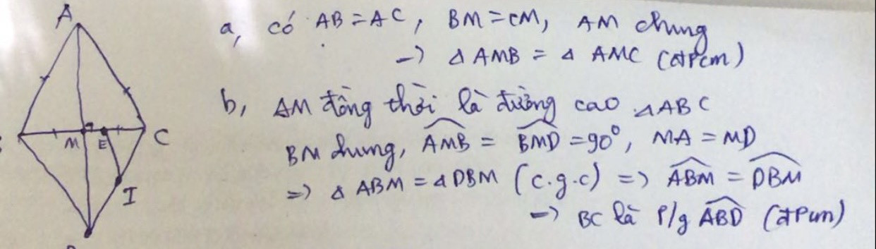 cho tam giác abc cân tại a có am là đường trung tuyến a, chứng minh amb =amc b,trên tia đối của tia ma lấy điểm d sao cho ma=md . chứng minh bc là tia phân giác của abd