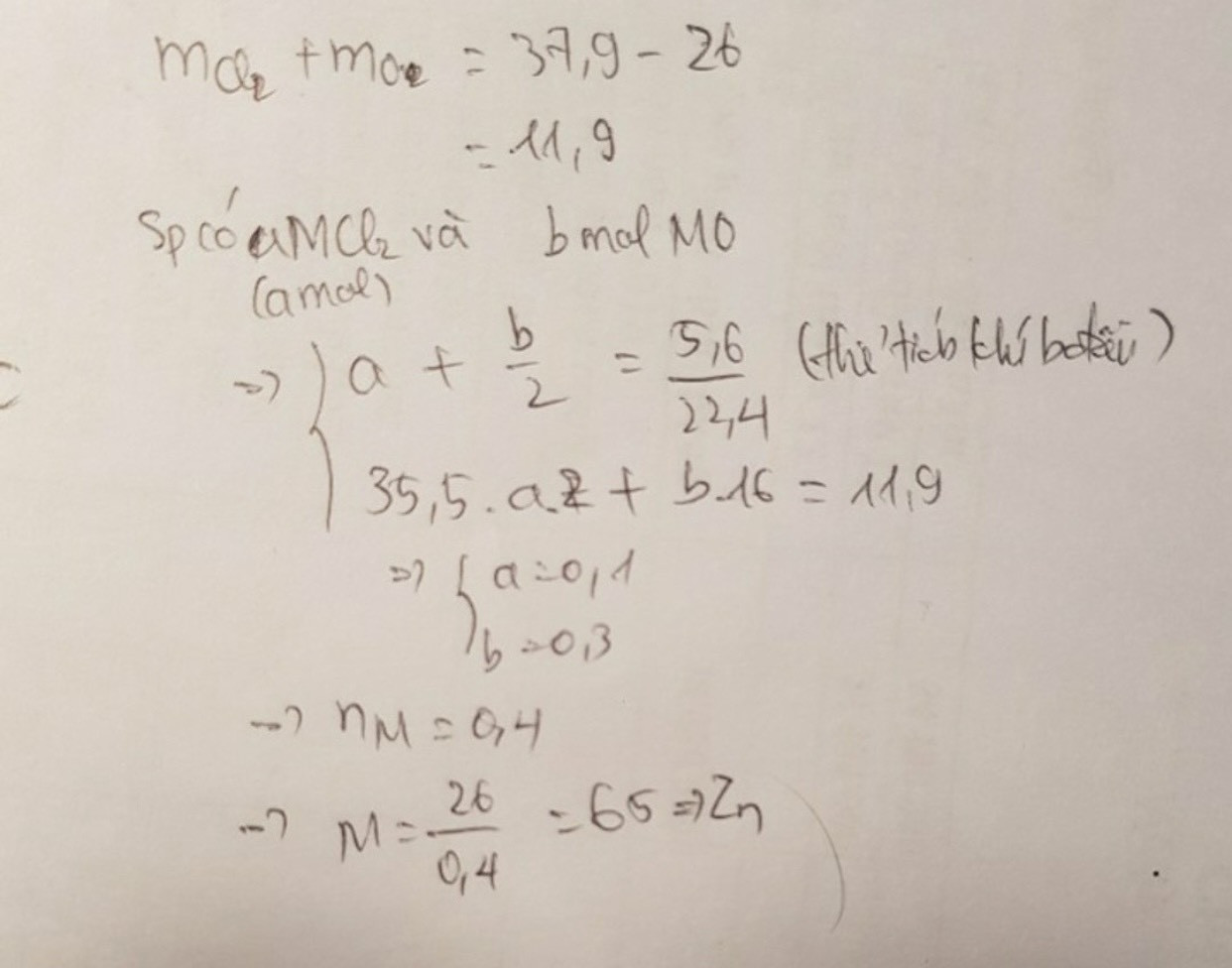 Cho 2,6g hỗn hợp Kim loại M có hóa trị II tác dụng vừa đủ với 0,56l hỗn hợp X gồm O2 và cl2 (đktc) . Sau phản ứng thu được 3,79g chất rắn là các oxit và muối . Tìm Kim loại M