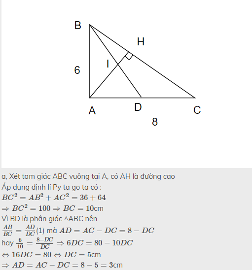 Cho tam giác ABC( Â=90 độ) có AB=6cm;Ac=8cm đường cao AH đường phân giác BD.Tính độ dài AD,DC