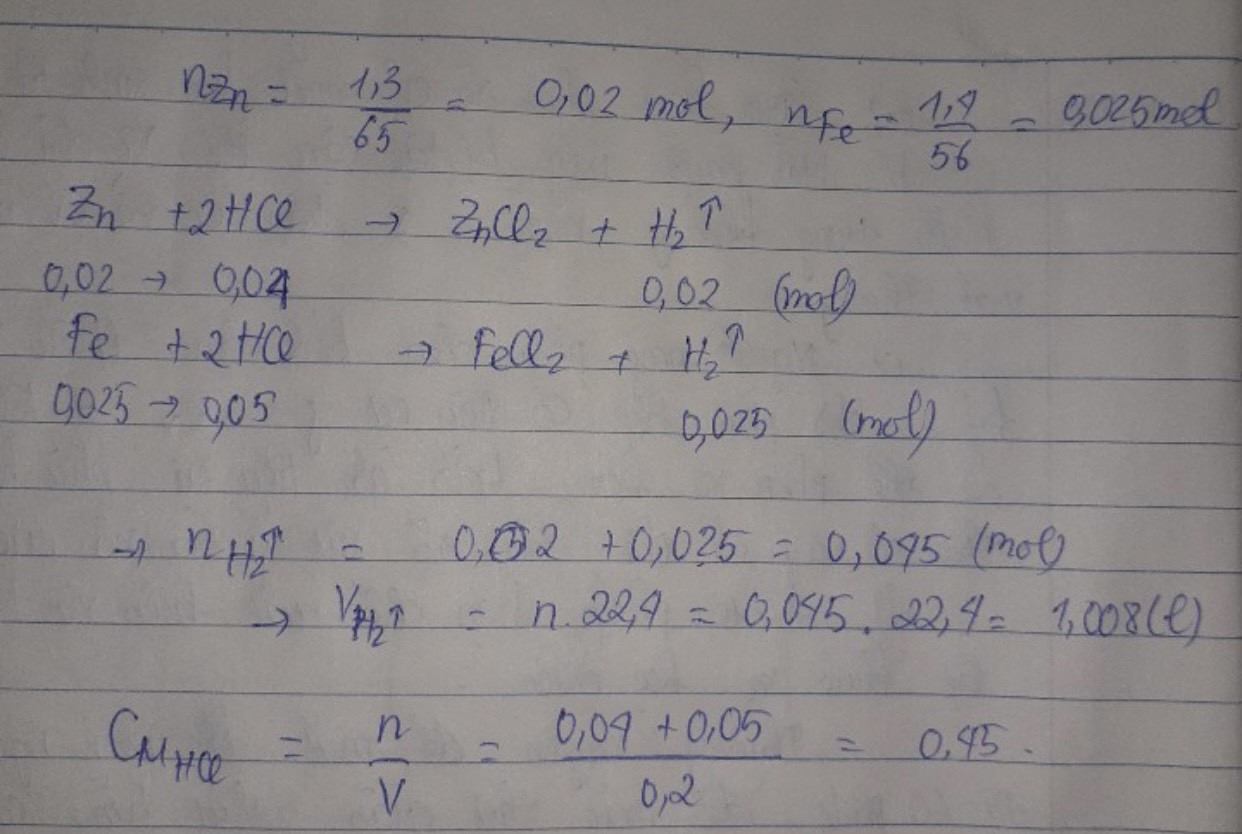 Cho hỗn hợp gồm 1,3 gam Zn và 1,4 gam Fe tác dụng với 200ml dung dịch HCL. Tính thể tích (đktc) của khí sinh ra ? Tính nồng độ mol của dung dịch HCL đã dùng