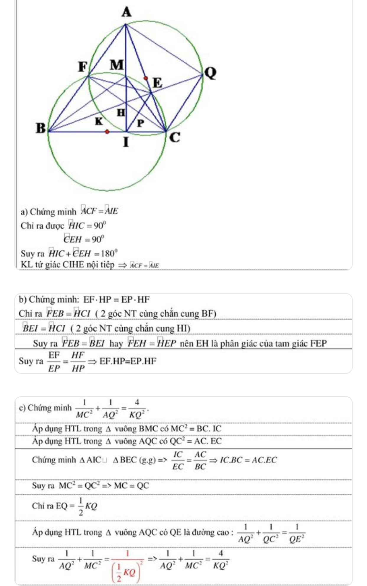 cho tam giác ABC nhọn ( AB>AC ). Đường tròn tâm O đường kính BC cắt AB,AC theo thứ tự tại F và E ; BE cắt CF tại H ; AH cắt BC tại I và cắt đường tròn tâm O tại M ( M nằm giữa A và I ). EB cắt đường tròn đường kính AC tại K và Q ( K nằm giữa B và E )