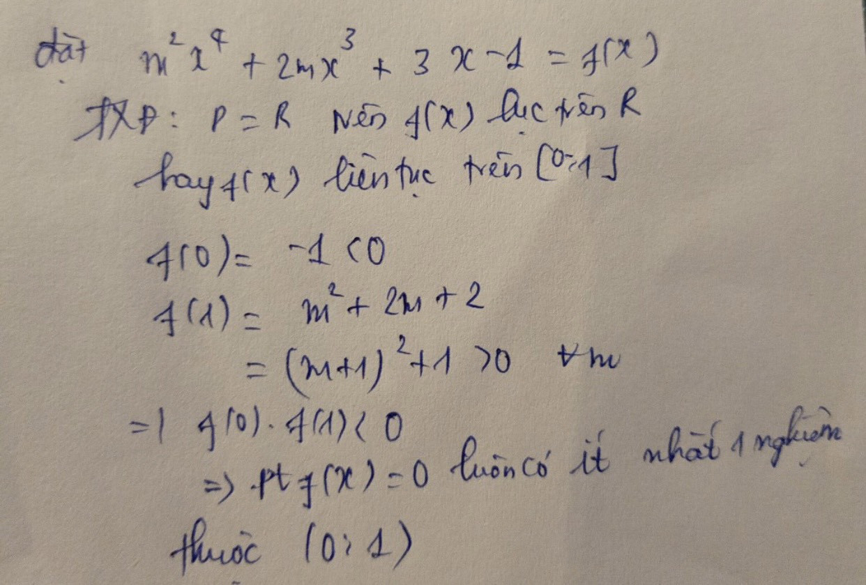 Chứng minh rằng phương trình m^2.x^4 + 2mx^3 +3x - 1 = 0 có nghiệm với mọi m