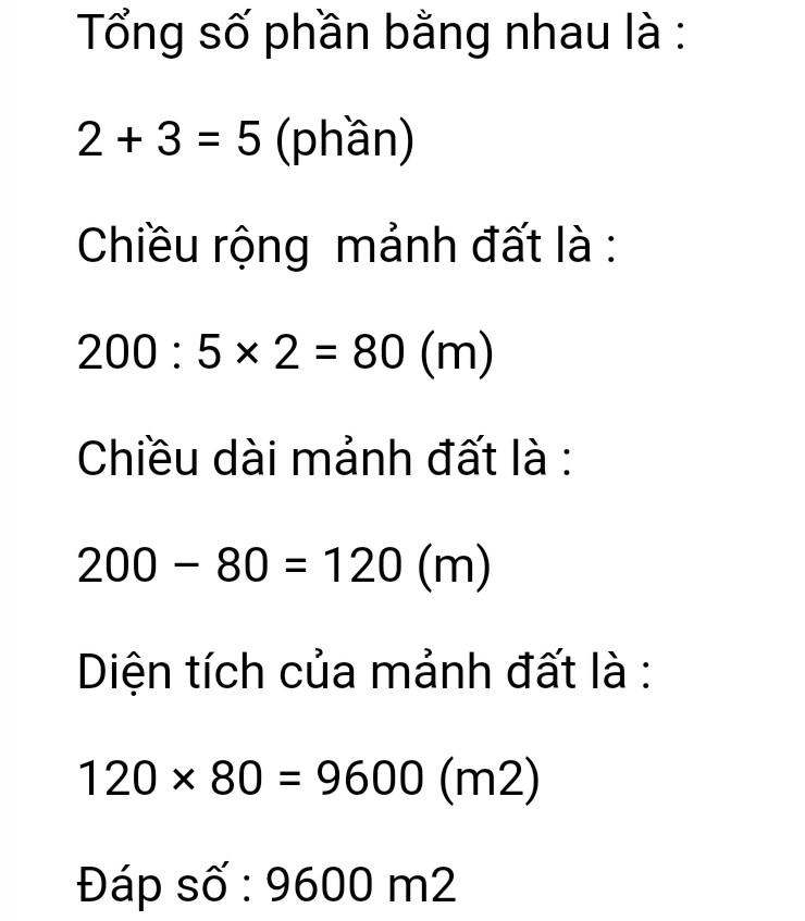 Một mảnh đất vườn hình chữ nhật có nửa chu vi là 200m,chiều rộng 2/3 chiều dài .Tính diện tích mảnh vườn đó