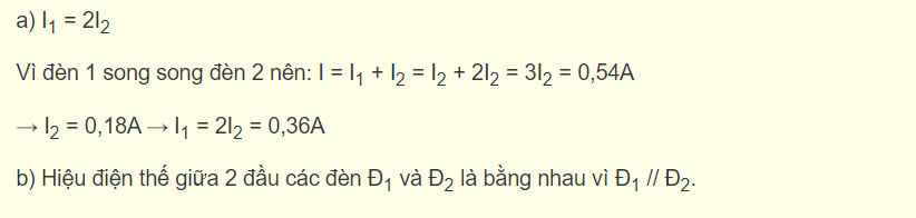 : Trong mạch điện có sơ đồ như hình dưới đâyampe kế có số chỉ I = 0,54A. Biết cường độ dòng điện đi qua đèn Đ1 lớn gấp hai lần cường độ dòng điện đi qua đèn Đ2.