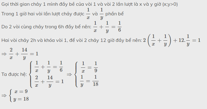 Hai vòi nước cùng chảy vào một bể cạn thì sau 6 giờ thì đầy bể . Nếu vòi 2 chảy riêng thì sau 15 giờ sẽ đầy bể . Lúc đầu người ta mở vời 1 trong 2 giờ sau đó khoá lại cho vòi 2 chảy tiếp đến khi đầy bể