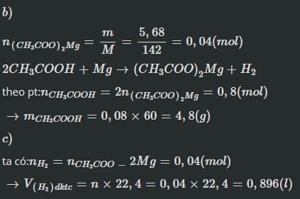cho dd CH3COOH tác dụng hết với Mg.cô cạn thu dc dd sau pứng,thu dc 5,68 g muối a,viết pt phản ứng b,tính khói lượng axit axetic đã dùng c,tính thể tích hidrro thu dc ở