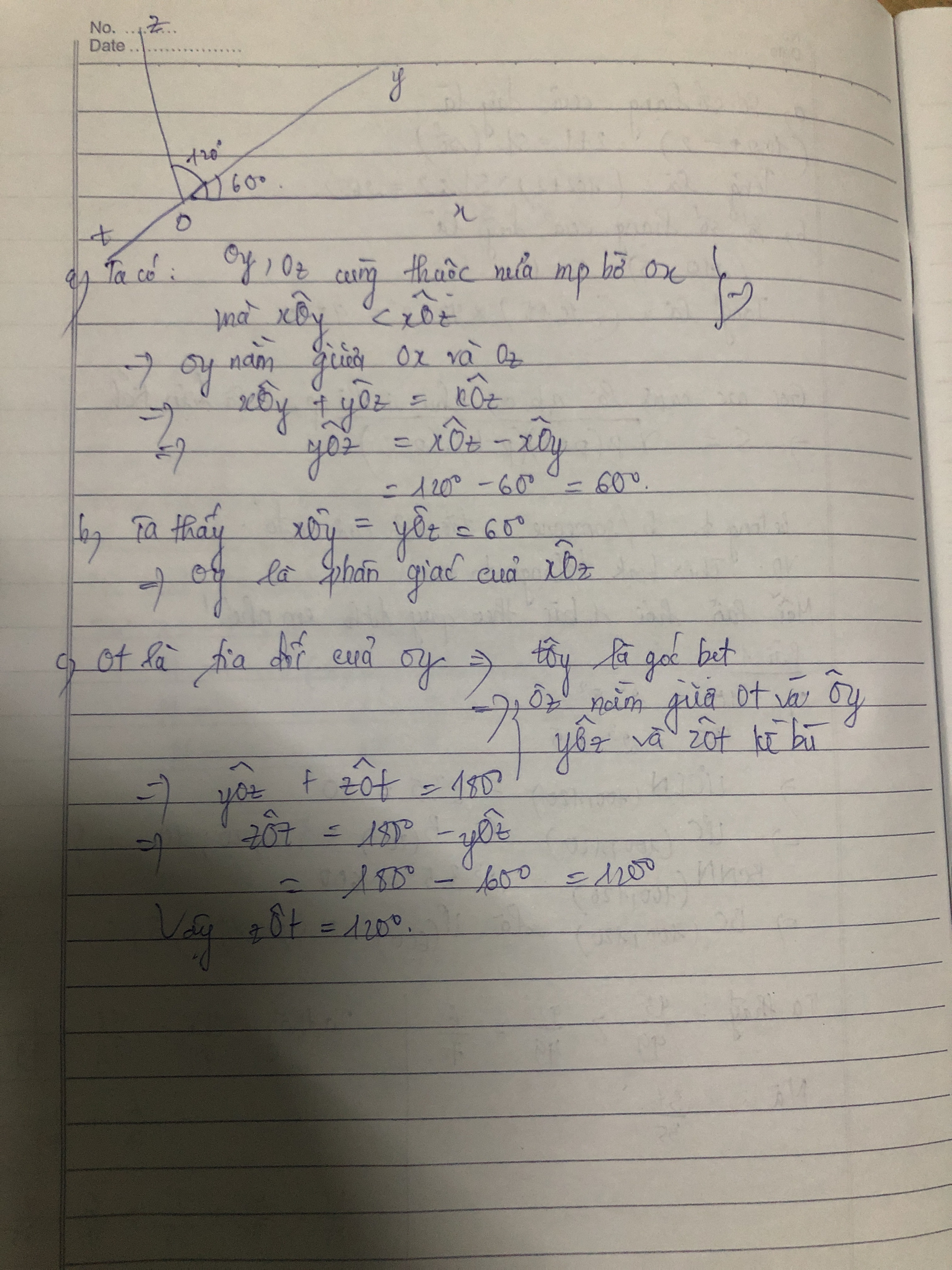 trên nửa mặt phẳng bờ là đường thẳng chứa tia Ox, có xOy = 60 độ, xOz = 120 độ => xOy < xOz nên tia Oy nằm giữa hai tia Ox,Oz.Ta có :